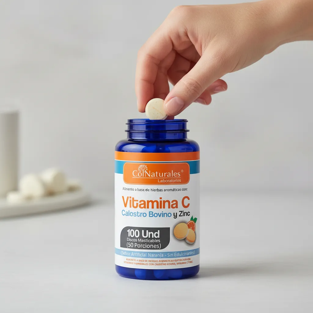 El complejo Vitamina C + Calostro Bovino + Zinc en discos masticables ofrece una forma cómoda, precisa y sin azúcar de proteger tu sistema inmunológico y favorecer la recuperación celular: